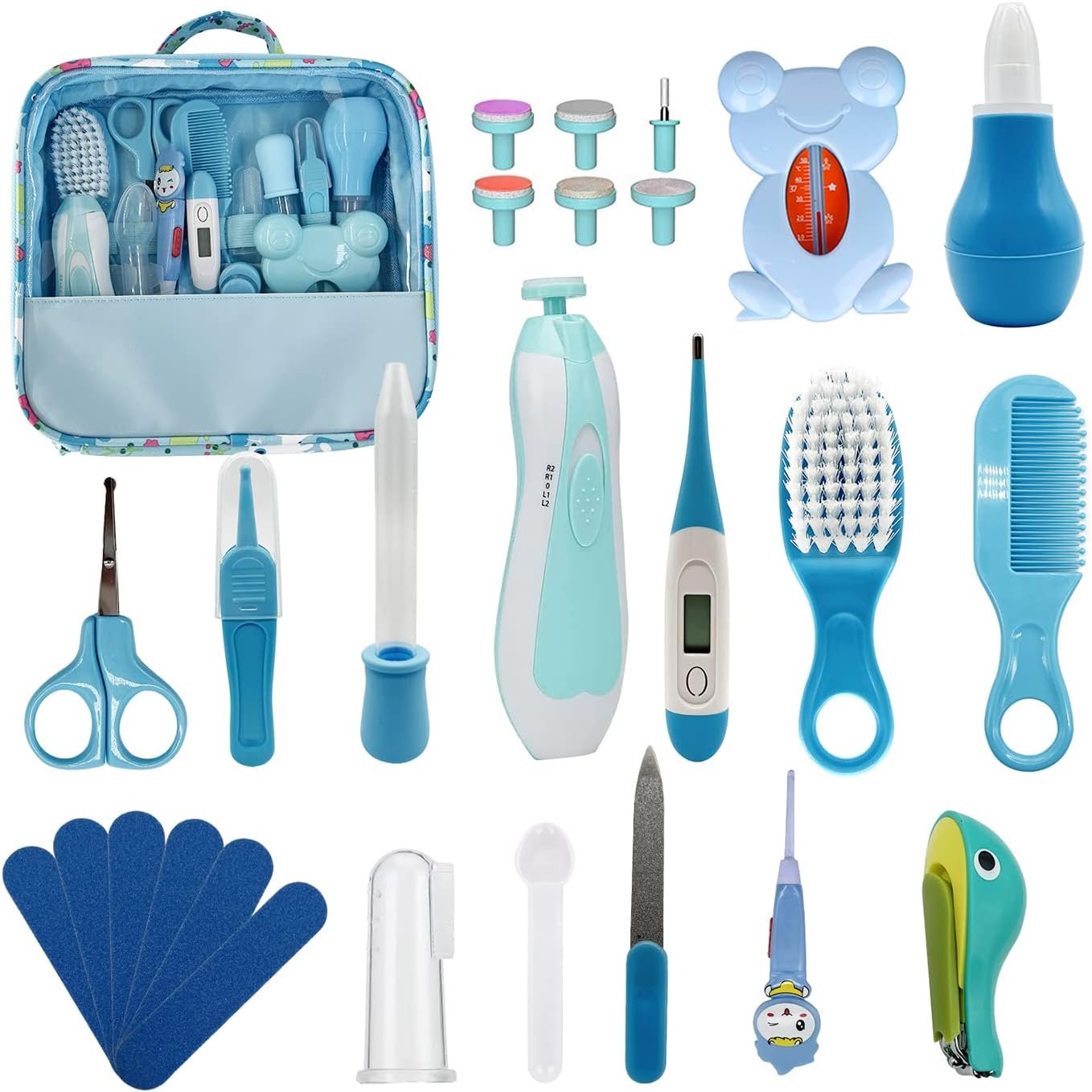 - Versatile: 26-in-1 set. Combs, brushes, tweezers, nail clippers, electric nail trimmers, 7 nail files, nasal aspirator, dropper, finger toothbrush, round head scissors, suitcase and 6 grinding heads, etc., to meet the baby’s daily needs. The best baby necessities/stuffs for newborns.