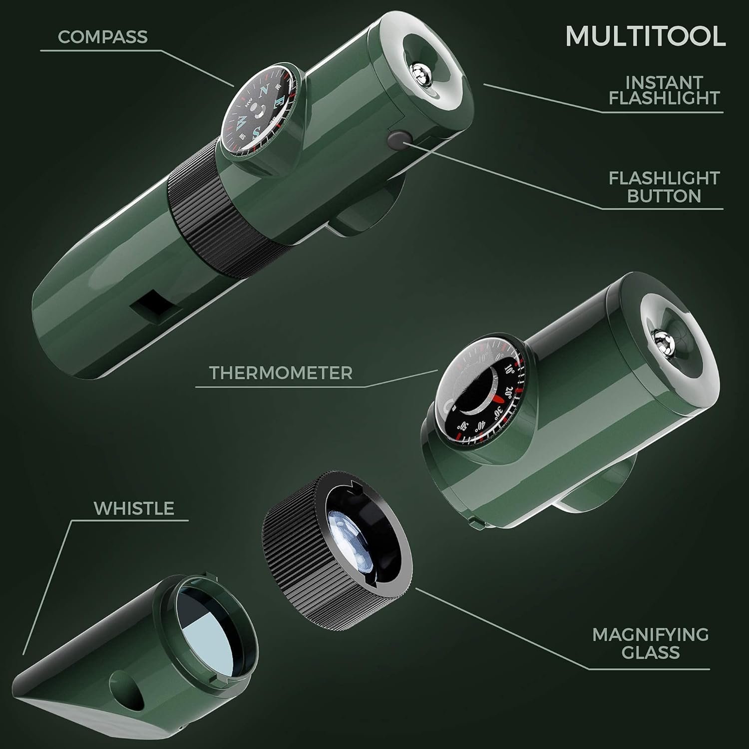 - Multi-tool (With 5 Functions): Compass: Perfect for learning basic directions and how to read maps. Thermometer: Also learn about Celsius & Fahrenheit with the included guide. Whistle: Have fun playing outdoor games. Instant flashlight: For that moment that you need a quick light. Magnifying glass: An additional specialized magnifying glass
