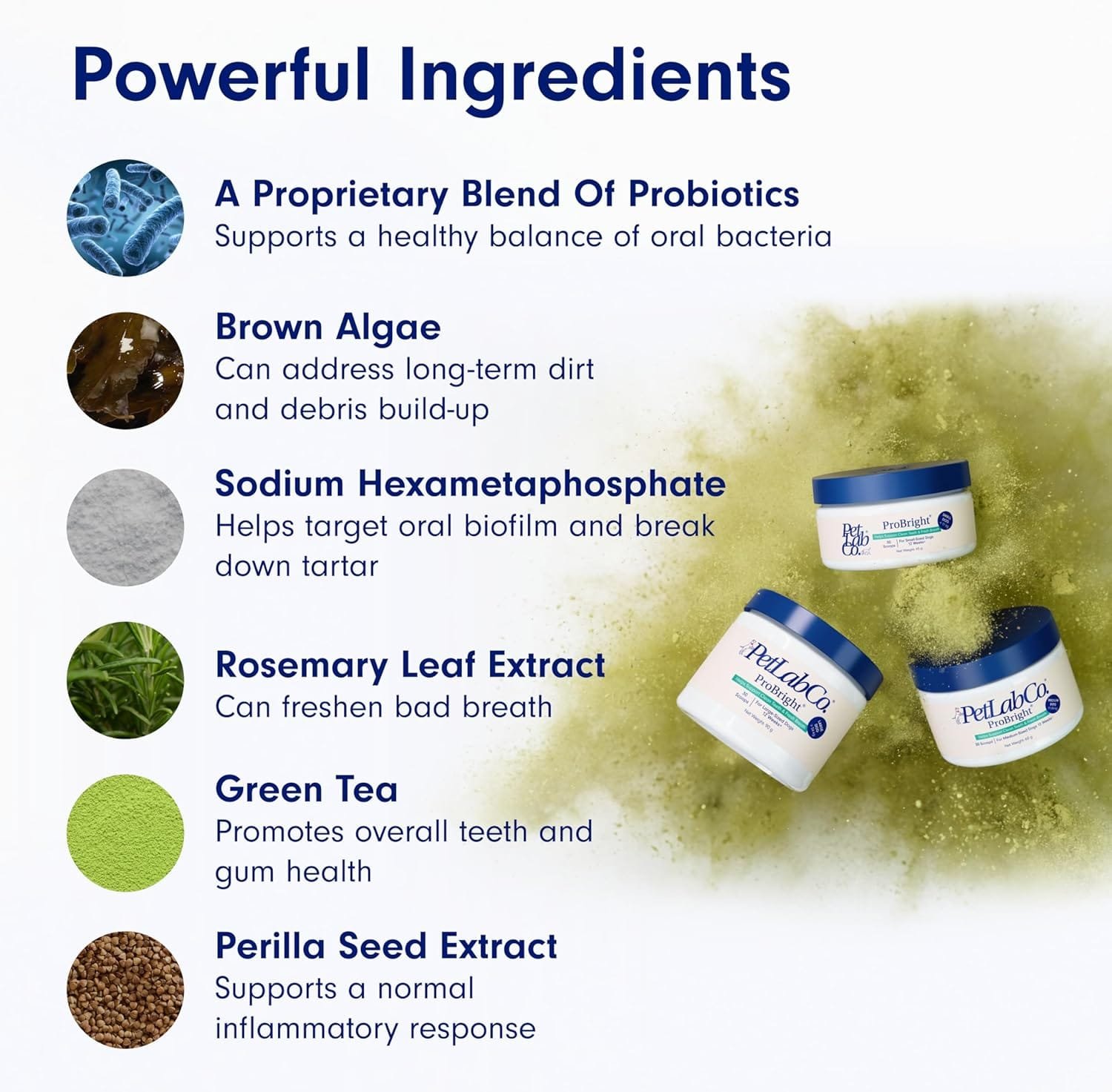 Active Ingredients: A Proprietary Blend of Probiotics (Lactobacillius helveticus , L. rhamnosus, Bifidobacterium longum), Brown Algae (Ascophyllum nodosum), Sodium Hexametaphosphate, Rosemary Leaf Extract, Perilla Seed Extract, Green Tea (Decaffeinated), Yeast (Palatant) – Inactive Ingredients: Calcium Bentonite, Dried Brewer’s Yeast, Spinach Powder